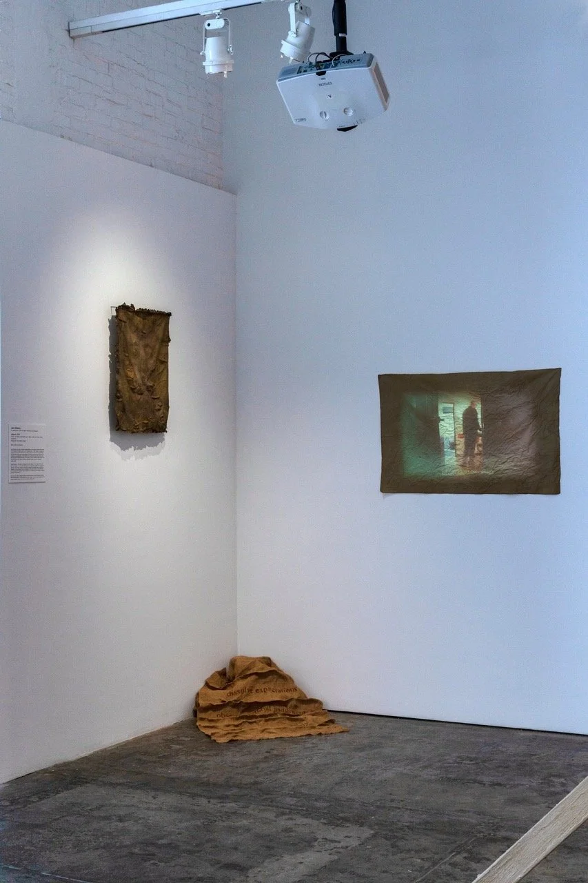 The photo above captures my intermedia installation currently on view in Philadelphia at Fabric Workshop and Museum through August 17 consisting of video, sublimination print treated with latex, and text on a burlap floor piece that is a meditation on living with chronic pain. Here is some background on my work there as an artist in residence: https://fabricworkshopandmuseum.org/artist/john-killacky/