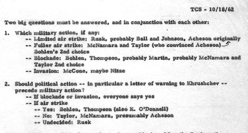 Memorandum by President Kennedy’s speech writer, Ted Sorensen, during the Cuban missile crisis