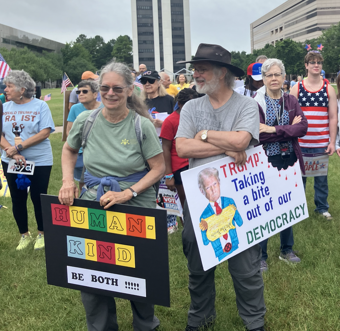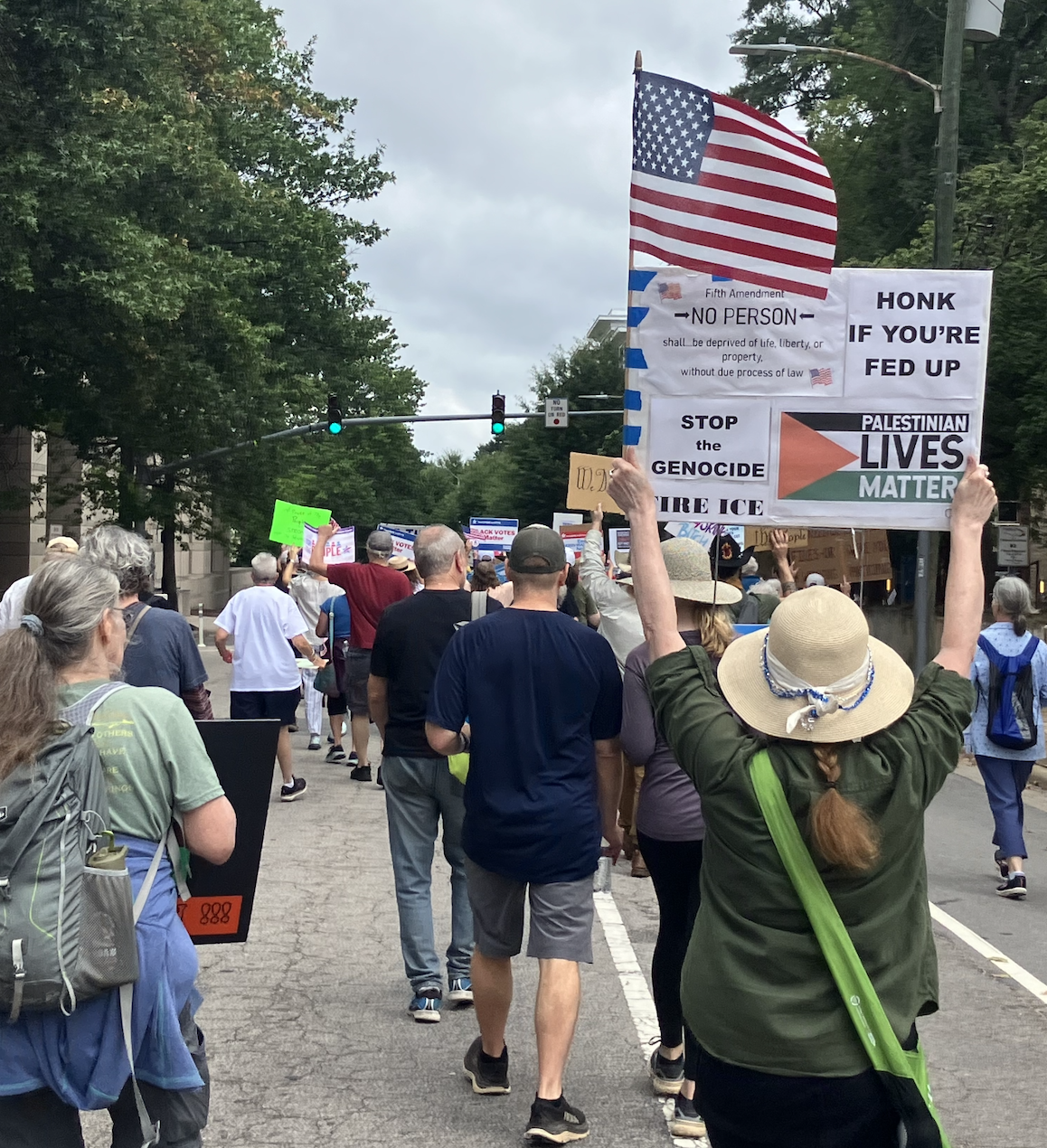 That is, a pretty overwhelming majority of those who came out to protest on a finally coolish Saturday morning were older, white, apparently straight and—if you can judge by their clothes and their cars—pretty solidly middle class. So, all in all, pretty much what we’ve seen before—at the Hands Off! and No Kings and other demonstrations we’ve attended.